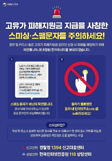 최근 지원금을 빙자해 인터넷 주소(URL) 클릭을 유도하는 사기 문자가 기승을 부리고 있는 데 따른 조치다.