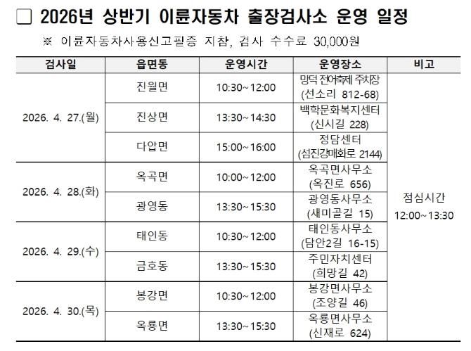 한방통신사 신다은기자 기자 | 광양시는 이륜자동차 정기검사의 원활한 추진과 검사소가 없는 지역 주민의 편의를 위해 4월 27일부터 30일까지 한국교통안전공단과 합동으로 2026년 상반기 이륜자동차 출장검사소를 운영한다고 밝혔다.
