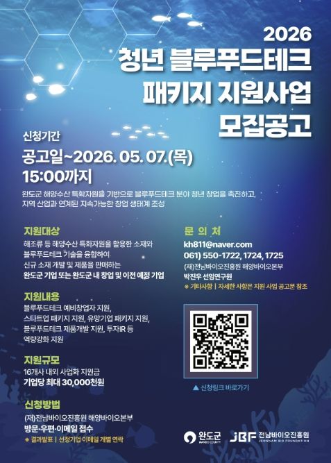한방통신사 신다은기자 기자 | 완도군은 지역의 해양 수산 자원을 고부가가치로 전환하고 청년 창업을 돕기 위해 ‘2026년도 청년 블루푸드테크 패키지 지원 사업’ 참가자를 모집한다.