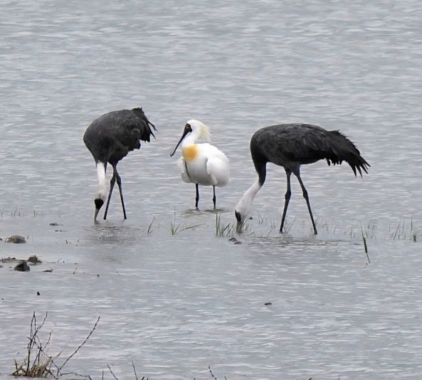 한방통신사 신다은기자 기자 | 지난 20일 순천만 복원습지에서 겨울철새인 흑두루미 한 쌍과 여름철새인 저어새가 한 장면에 포착됐다.