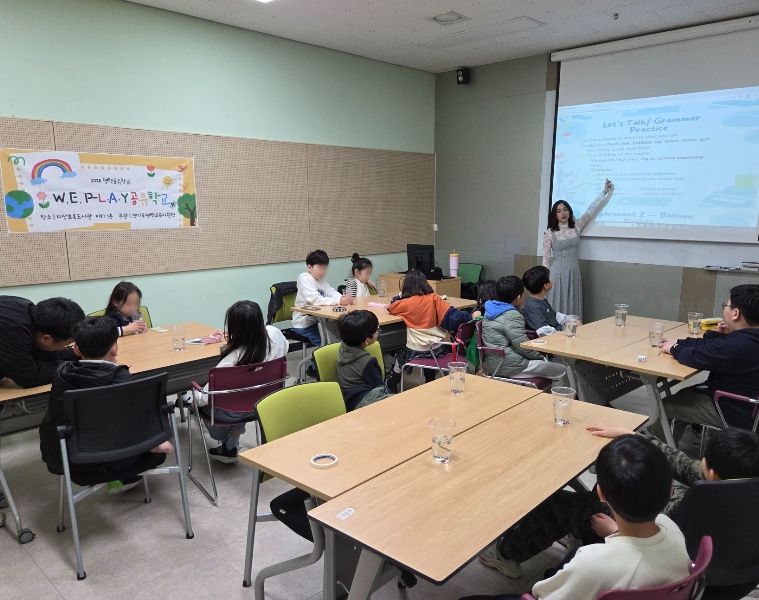 이번 프로그램은 지역 초등학교 3~4학년 학생 16명이 참여한 가운데, 지난 3월 14일부터 4월 18일까지 매주 토요일 총 6회에 걸쳐 지산초록도서관 지하 강의실에서 진행됐다. 학생들은 원어민과 함께하는 한국 전통 놀이, 음식 만들기 및 이국적인 음식 체험, 과학 실험 등 다양한 놀이와 체험을 통해 자연스럽게 영어를 접하며 다른 문화를 이해하고 언어와 비언어적 요소를 경험하는 시간을 가졌다.
