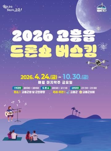 한방통신사 신다은기자 기자 | 고흥군은 ‘2026 고흥읍 드론쇼 버스킹 공연’을 오는 4월 24일부터 10월 24일까지 7개월간 매월 마지막 주 금요일 고흥군청 앞 군민광장에서 개최한다고 밝혔다.