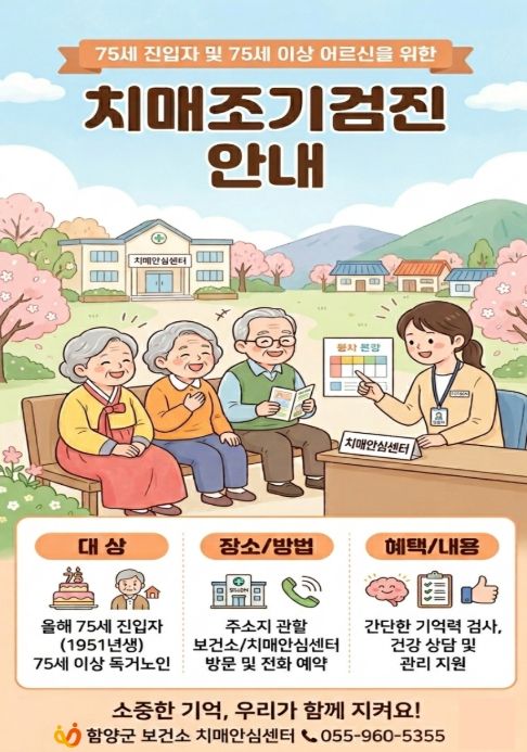 함양군 관계자는 “치매는 조기에 발견할수록 관리가 쉬워지고 삶의 질을 오래 지킬 수 있다”라며 “대상자들이 정기적인 검진에 참여해 건강한 노후를 준비할 수 있도록 적극 안내해 나가겠다”라고 말했다.