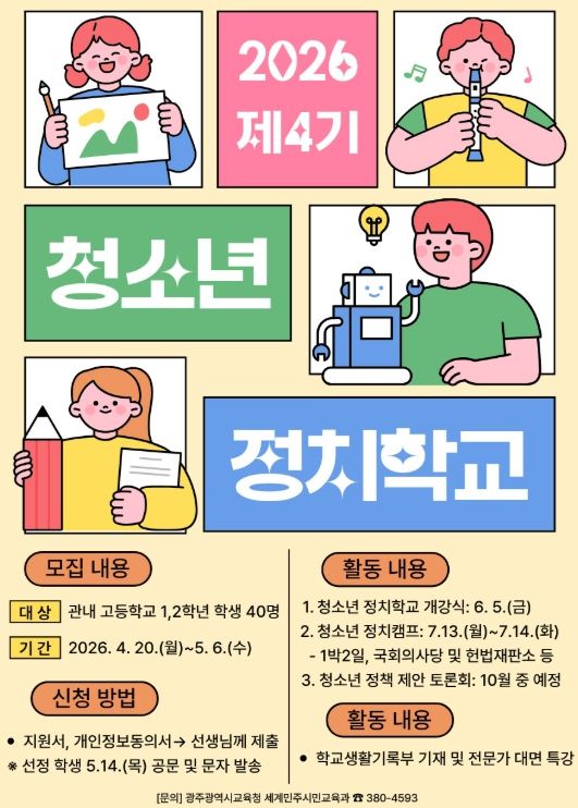 한방통신사 김성의 기자 | 광주시교육청은 청소년의 정치참여 역량을 키우기 위해 ‘제4기 청소년 정치학교’ 참가자를 모집한다.