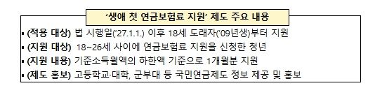 아울러 첫 보험료 지원으로 국민연금 가입자가 된 후에는 두루누리 보험료 지원, 저소득 지역가입자 보험료 지원, 실업크레딧 등 다양한 지원 제도의 혜택을 받을 수 있다.