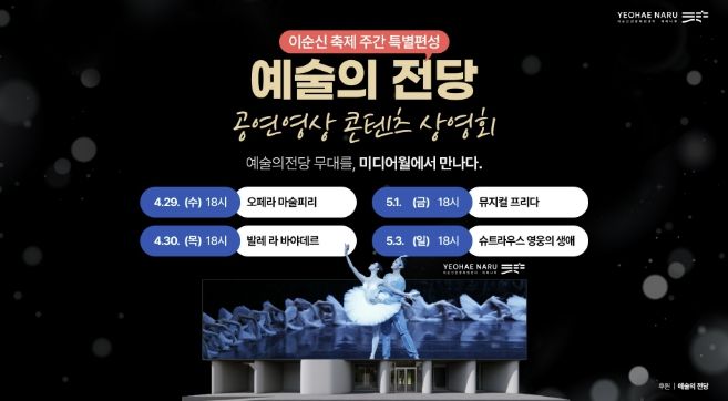특히 ‘제65회 아산 성웅 이순신축제’ 기간(4/28~5/3)에는 특별 상영이 진행된다. 4월 29일 오페라 '마술피리', 4월 30일 발레 '라 바야데르', 5월 1일 뮤지컬 '프리다', 5월 3일 음악회 '영웅의 생애' 등 대표 작품들이 연이어 상영될 예정이다.