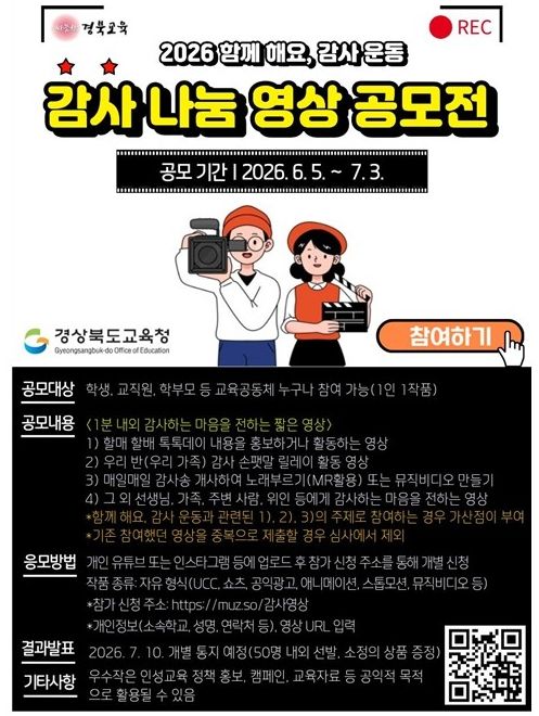 한방통신사 신유철기자 기자 | 경북교육청은 학생과 학부모, 교직원 등 교육공동체가 함께 감사의 마음을 나누는 문화를 확산하기 위해 ‘감사 나눔 영상 공모전’을 개최한다고 24일 밝혔다.