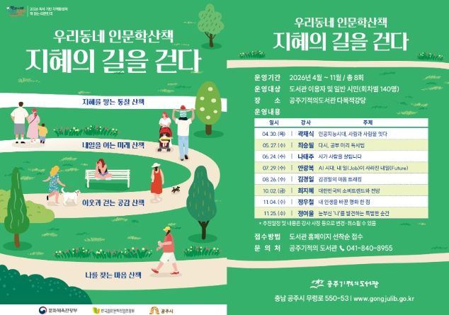 한방통신사 신태공 기자 | 공주시는 시민의 인문학적 소양을 높이고 독서 문화를 확산하기 위해 ‘우리 동네 인문학 산책 : 지혜의 길을 걷다’ 프로그램을 본격 운영한다고 밝혔다.