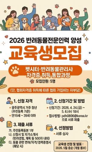 한방통신사 김성의 기자 | 광주광역시는 반려동물 산업 성장에 대응하고 전문역량을 갖춘 인재 양성을 위한 ‘2026년 반려동물 전문인력 양성교육’을 실시한다.