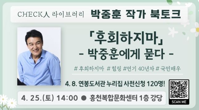 한방통신사 양호선기자 기자 | 홍천 군립 도서관이 오는 4월 25일 오후 2시 홍천 복합 문화센터 1층 강당에서 배우 겸 작가 박중훈을 초청해 2026년 ‘체크인 라이브러리’의 첫 번째 북토크를 개최한다.