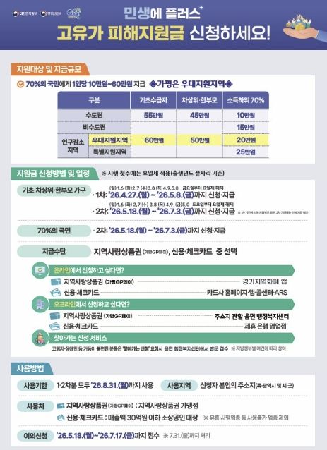 지급 금액은 지역에 따라 차등 적용된다. 일반적인 수도권 지역은 기초생활수급자 55만 원, 차상위계층·한부모가족 45만 원, 소득 하위 70% 10만 원을 지급한다. 반면 가평군민은 인구감소지역 우대지원 대상에 포함돼 기초생활수급자 60만 원, 차상위계층·한부모가족 50만 원을 받으며, 소득 하위 70%에게도 수도권 지역의 두 배인 20만 원을 각각 지급한다.