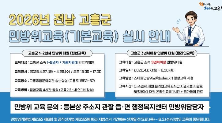 한방통신사 신다은기자 기자 | 고흥군은 민방위대원의 대응 역량을 강화하고자 2026년 상반기 민방위 기본교육을 실시한다고 밝혔다.