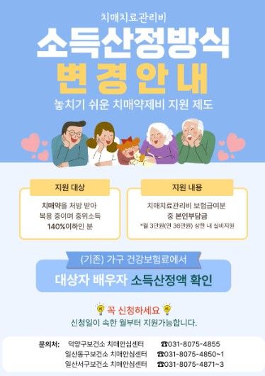 한방통신사 신유철기자 기자 | 고양특례시 일산서구보건소 치매안심센터가 치매 환자의 경제적 부담을 완화하고 지속적인 치료를 돕기 위해 ‘치매치료관리비 지원사업’의 대상자를 올해 상시 모집한다.