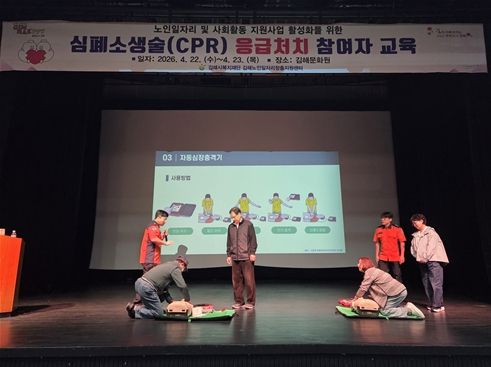 한방통신사 신유철기자 기자 | (재)김해시복지재단 김해시니어클럽(김해노인일자리창출지원센터)에서는 지난 22일부터 23일까지 이틀간 김해문화원 공연장에서 노인일자리 노인역량활용사업 참여자를 대상으로 ‘심폐소생술(CPR) 응급처치 교육’을 실시했다.