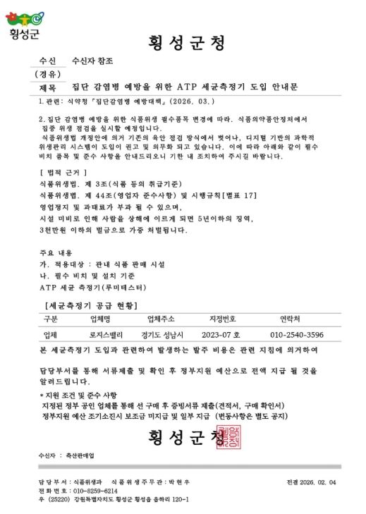 횡성군에 따르면, ‘ATP 세균측정기’ 등 식품위생 장비 도입을 안내하는 것처럼 위장한 허위 공문이 일부 식품영업자에게 발송되고 있다.