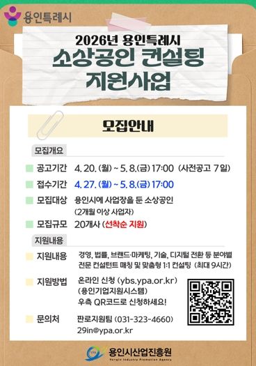 한방통신사 신유철기자 기자 | 용인특례시와 용인시산업진흥원은 ‘2026년 용인시 소상공인 창업 및 경영 컨설팅 지원사업’에 참여할 소상공인을 모집한다고 26일 밝혔다.