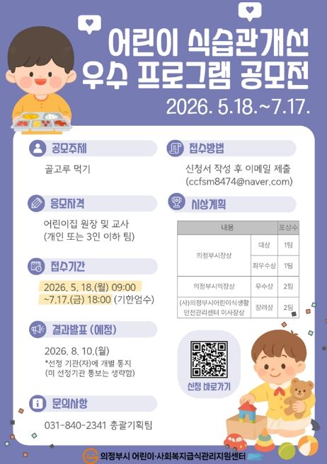 한방통신사 신유철기자 기자 | 의정부시가 운영하는 의정부시 어린이‧사회복지급식관리지원센터는 어린이 보육시설을 대상으로 5월 18일부터 7월 17일까지 ‘어린이 식습관 개선 우수 프로그램 공모전’을 개최한다.