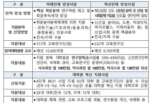 두뇌한국(BK)21 사업은 석·박사급 인재 양성 및 세계 수준의 연구중심대학 육성을 목표로 1999년부터 추진되어 온 대표적인 대학원 지원 사업이다. 현재 4단계 사업(7년, ’20.9.~’27.8.)이 운영 중이며, 매년 약 2만 명의 대학원생과 신진 연구자를 지원하고 있다.