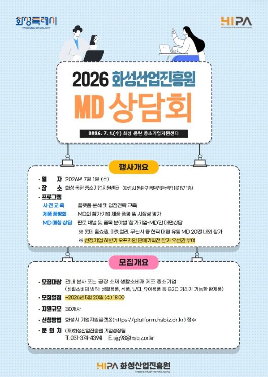한방통신사 신유철기자 기자 | 화성산업진흥원(원장 전병선)은 화성시 생활소비재 기업의 대형 유통망 진입과 신규 판매채널 확보를 지원하기 위해 ‘2026년 화성산업진흥원 MD 상담회’를 개최하고, 오는 5월 20일까지 참여기업을 모집한다.