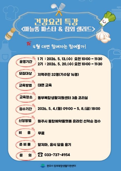 한방통신사 양호선기자 기자 | 원주시 동부복합생활지원센터는 다음 달 4일부터 ‘마늘쫑 파스타·참외 샐러드 만들기’ 건강 요리 특강 프로그램 참여자를 모집한다.