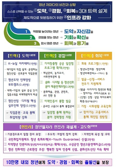 정부는 이러한 문제 인식 하에 2030 청년들의 현장 목소리를 바탕으로 새로운 출발선을 제공하기 위해 이번 「청년뉴딜 추진방안」을 마련했다. 청년들이 자신의 비전과 상황을 고려하여 적합한 프로그램을 선택할 수 있도록 ➊도약, ➋경험, ➌회복이라는 세 가지 트랙을 제시하고, 원활한 구직활동과 채용을 뒷받침하기 위해 ➍정책 인프라도 고도화했다.