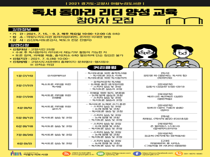 고양시(시장 이재준) 아람누리도서관은 경기도 독서동아리 활성화 사업 지원기관으로 선정돼 오는 7월 15일부터‘독서동아리 리더 양성과정’을 운영한다.