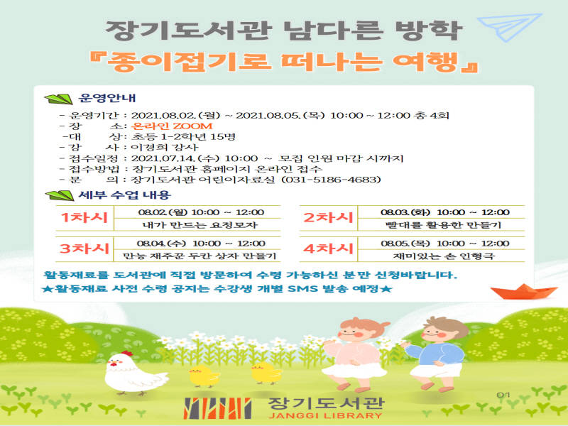 김포시 장기도서관은 여름방학을 맞은 관내 초등학생 1~2학년 15명을 대상으로, 2021년 8월 2일(월)부터 5(목)일까지 4일간 남다른 방학 『종이접기로 떠나는 여행』 강좌를 운영하며 비대면 온라인 실시간 방송(Zoom)으로 진행한다.