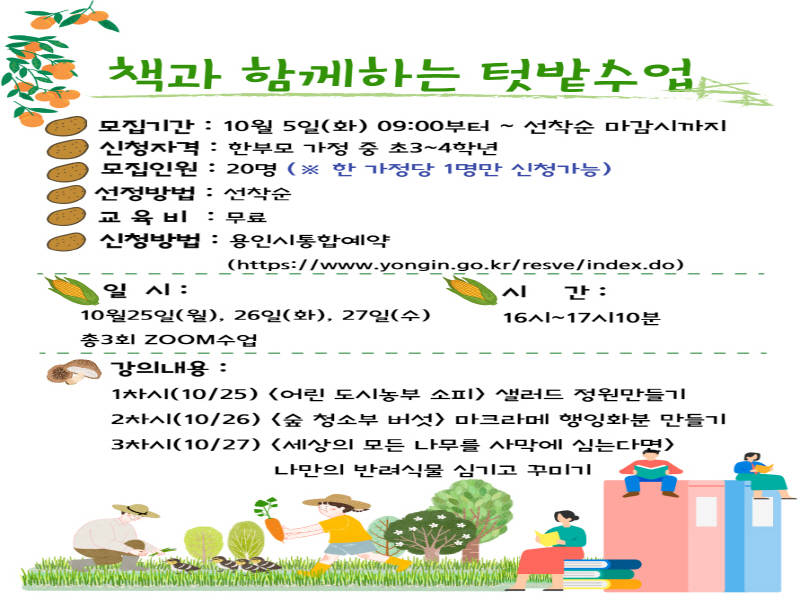 용인시는 오는 5일부터 ‘책과 함께하는 텃밭 수업’에 참여할 한부모가정 의 초등학생 20명을 선착순 모집한다.