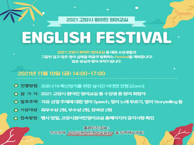고양시(시장 이재준)가 오는 11월 19일(금) 오후 2시에 ‘2021 고양시 원어민 영어교실 English Festival’을 비대면(ZOOM) 방식으로 개최한다.