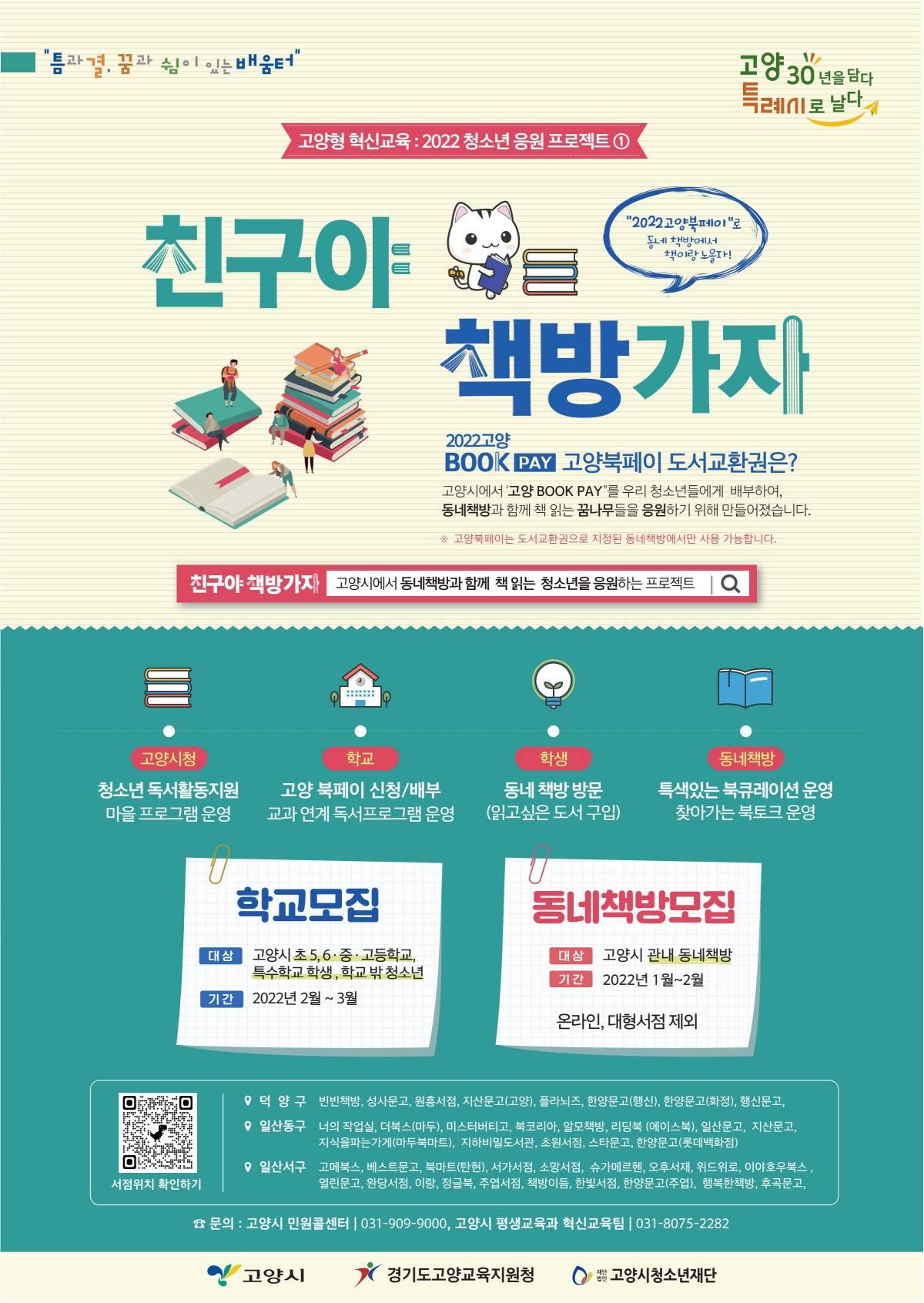 고양시(시장 이재준)가 관내 동네 책방과 연계한 청소년 독서활동 지원을 위해 작년에 이어 ‘친구야~ 책방가자!’사업을 운영하고 참여 학교를 오는 3월 21일(월)까지 모집한다.시는 ‘친구야~ 책방가자!’사업을 통해 15,000원 상당의 고양 북페이 도서교환권을 배부한다. 청소년이 동네 책방에 방문해 다양한 분야의 책을 직접 고르고 독서에 흥미를 가질 수 있도록 응원한다는 취지다.