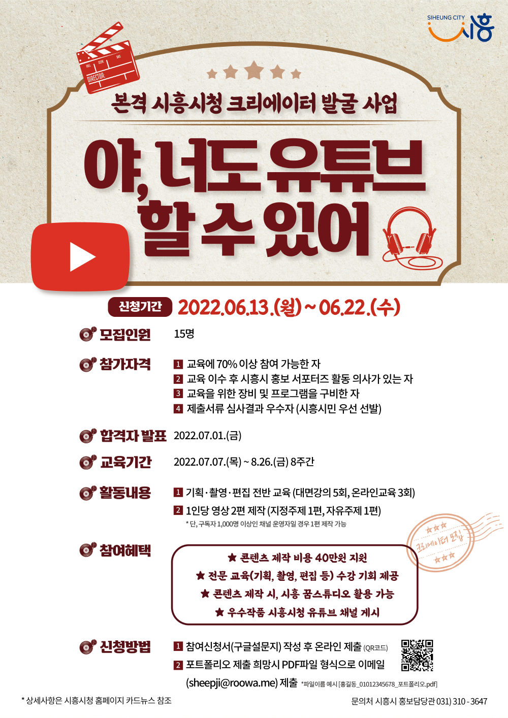 자세한 사항은 시흥시청 홈페이지(www.siheung.go.kr)를 확인하거나 홍보담당관 영상홍보팀(031-310-3647)으로 문의하면 된다.