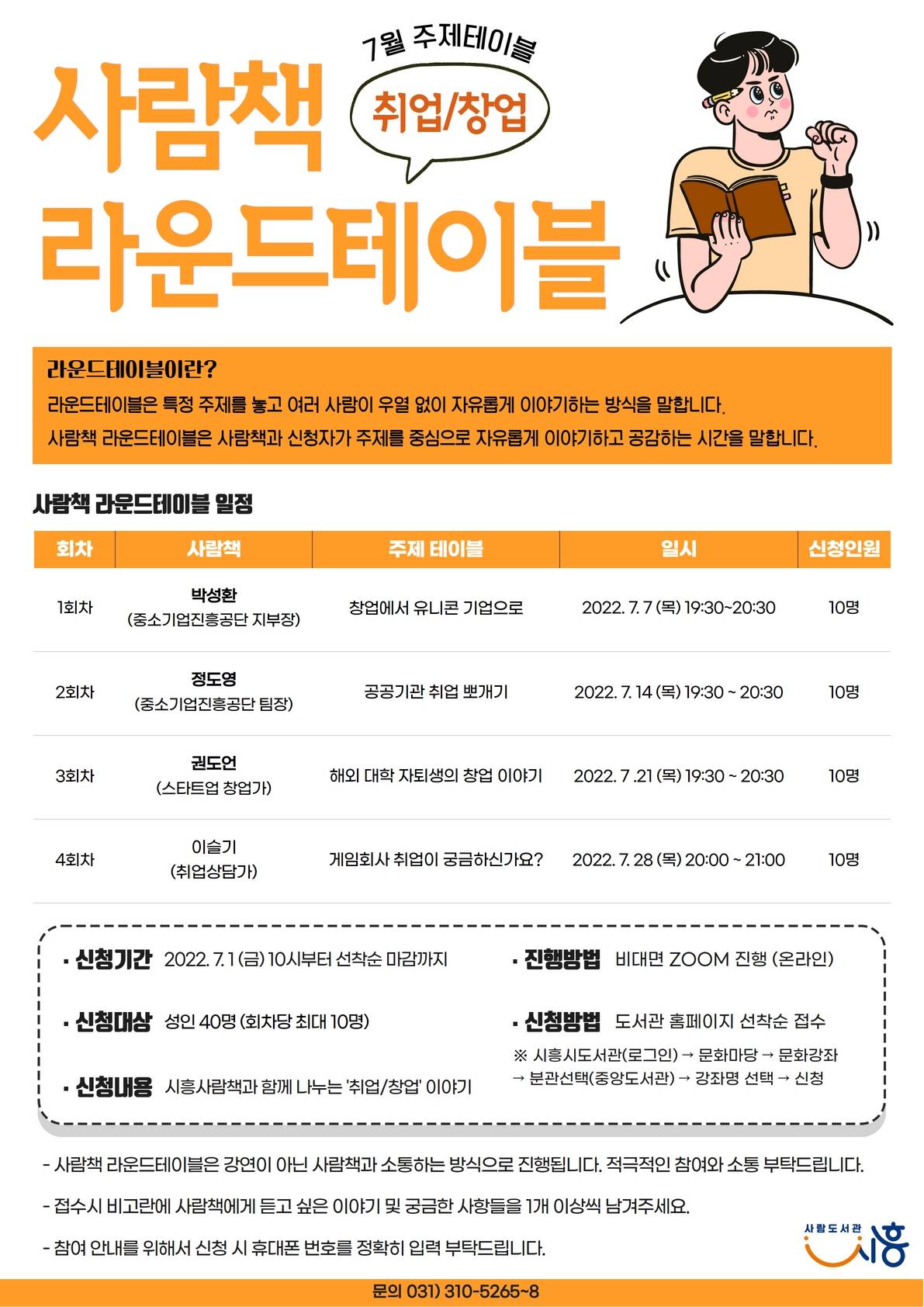 시흥사람도서관은 매월 선정된 주제로 자신의 경험과 재능을 이야기로 나누는 사람책 열람의 기회를 시민에게 제공하는「사람책 라운드 테이블」의 7월 주제를 ‘취업/창업’으로 선정해 시민들의 고민을 함께 나눈다.취업과 창업에 대한 고민과 이야기를 공유하고, 노하우를 전수하기 위해 중소벤처기업진흥공단, 스타트업 창업가, 취업상담사 등 다양한 분야의 시흥사람책을 선정한다. 선정된 사람책의 취업/창업의 노하우는 7월 7일부터 매주 목요일마다 온라인 화상회의 플랫폼인 줌(ZOOM)을 통한 비대면으로 함께할 예정이다.