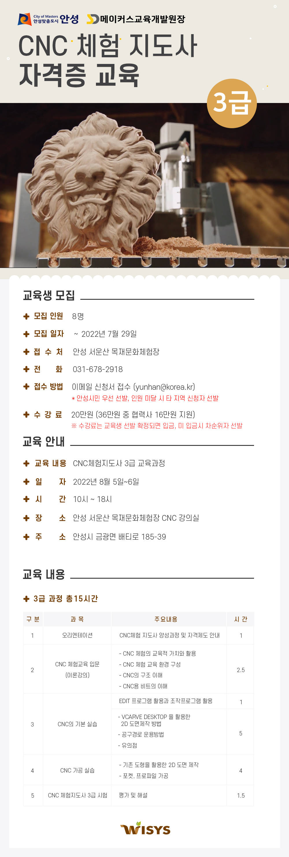 CNC체험지도사 자격증반은 ㈜에스디상사(SD메이커스 교육개발원)와 업무협약을 통해 안성 서운산 목재문화체험장에서 시행하는 것으로 올해는 8월과 10월 총 2차례 진행할 예정이다.