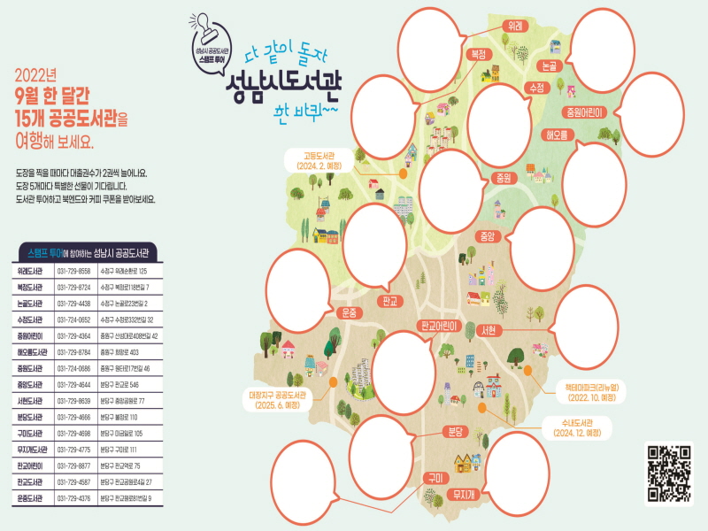 이 프로그램은 투어 용지에 지도로 표시된 15곳 성남시 공공도서관을 방문해 책을 빌리고서 확인 도장을 찍는 방식이다.