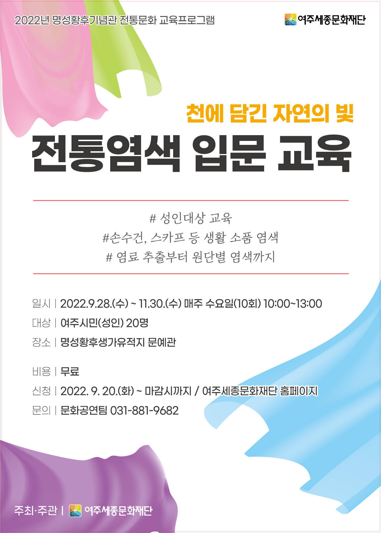 여주세종문화재단은 오는 20일부터 명성황후기념관 전통문화 교육프로그램 ‘천에 담긴 자연의 빛-전통염색 입문 교육’ 수강생을 모집한다.
