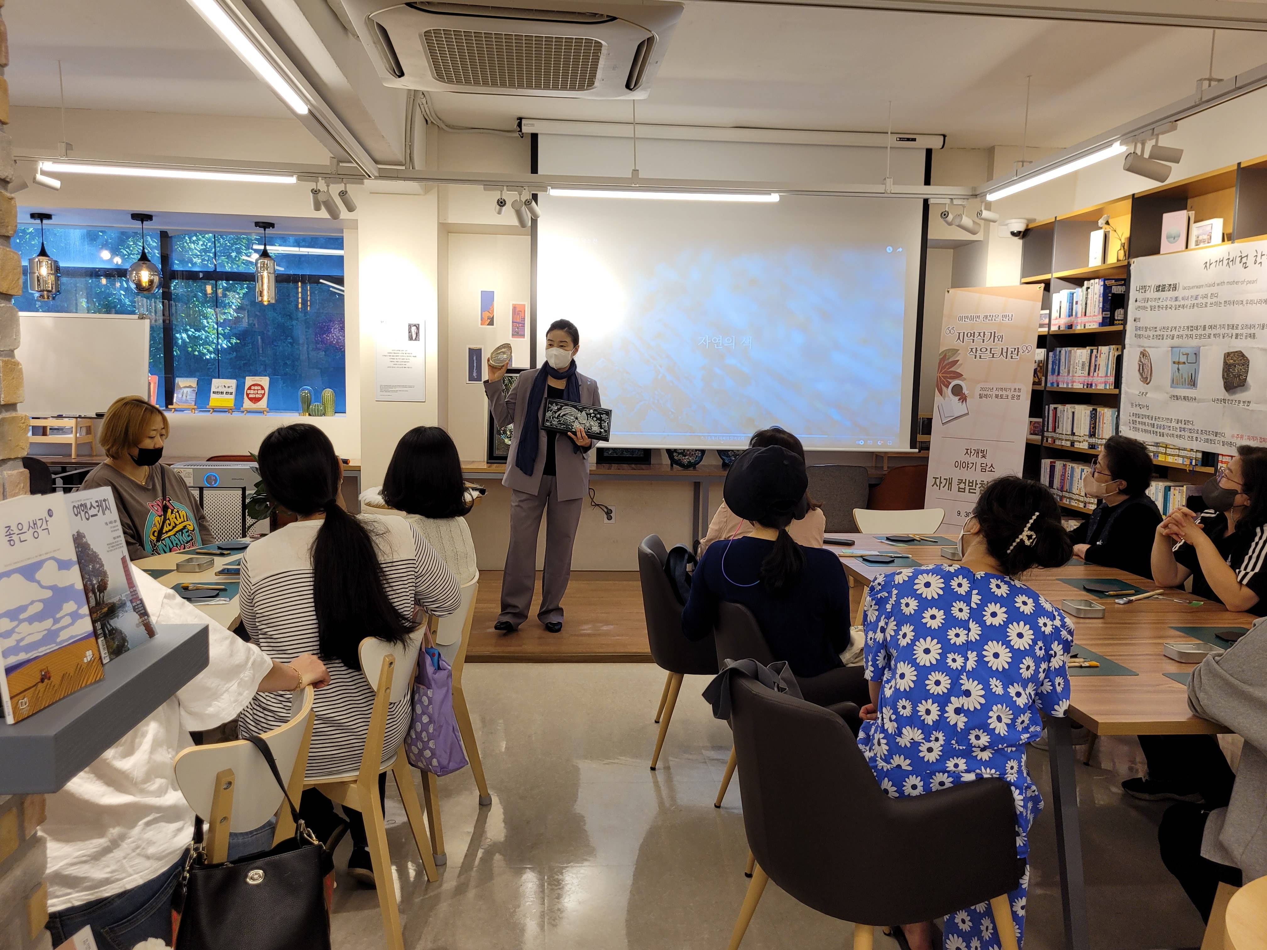 이번 북토크에서 김윤미 작가는 본인이 소장하고 있는 재떨이, 소반 등의 실물 작품을 보여주면서 자개 공예의 역사와 내용 등 예전 할머니, 어머니 세대의 가구로 활용되던 자개 공예가 현대에 와서는 어떻게 변화되고 발전했는지에 대해 자세히 소개했으며 이어서 자개 재료를 이용한 컵받침 만들기 체험으로 북토크를 마무리하였다.
