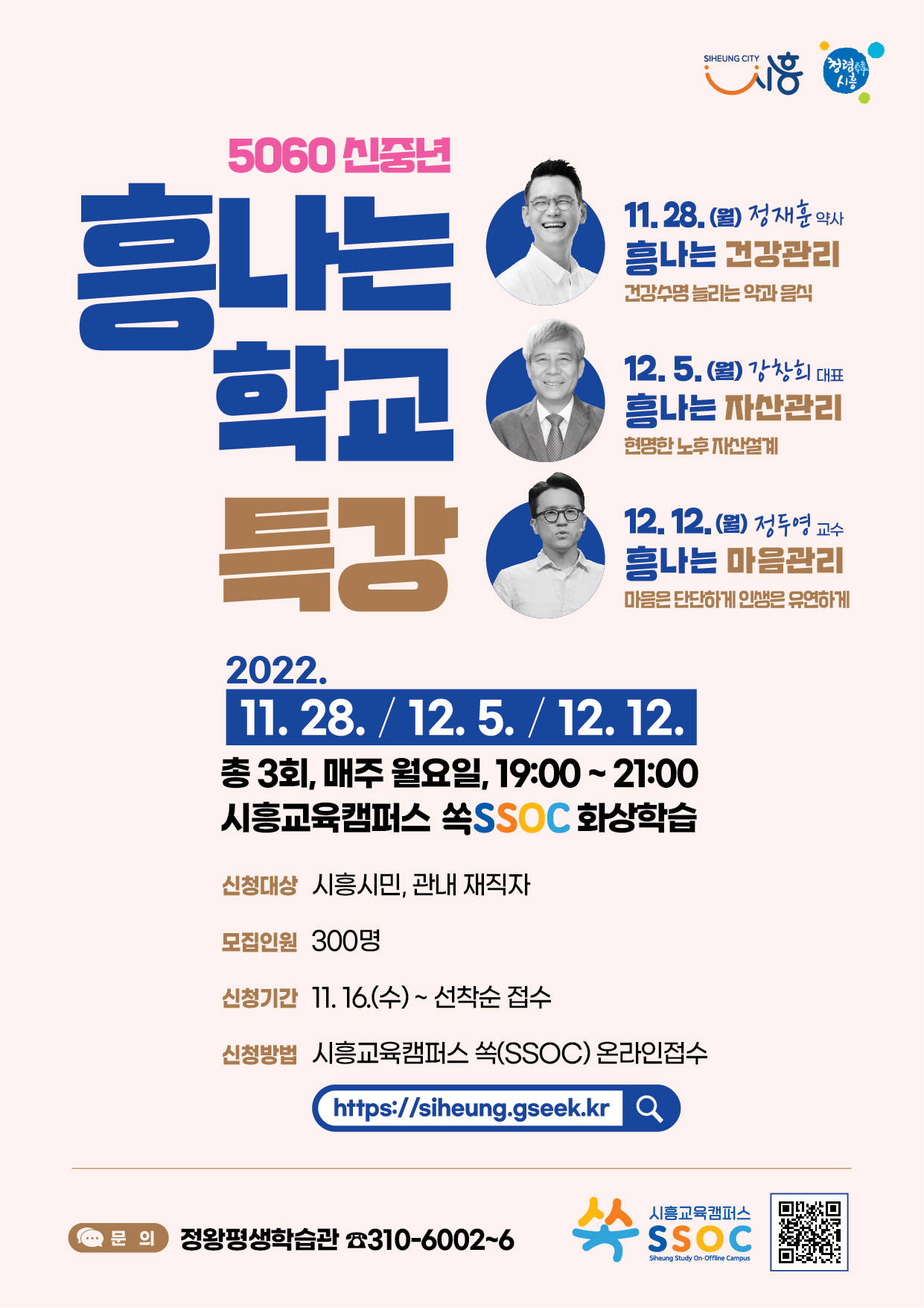 이번 특강은 흥나는 ‘건강’ 관리, 흥나는 ‘자산’ 관리, 흥나는 ‘마음’ 관리라는 주제로 온라인 학습공간인 시흥교육캠퍼스 ‘쏙(SSOC)’의 화상학습을 통해 진행되며, 건강하고 적극적인 은퇴생활을 준비하고 싶은 45세 이상 시흥시민이면 누구나 참여할 수 있다.