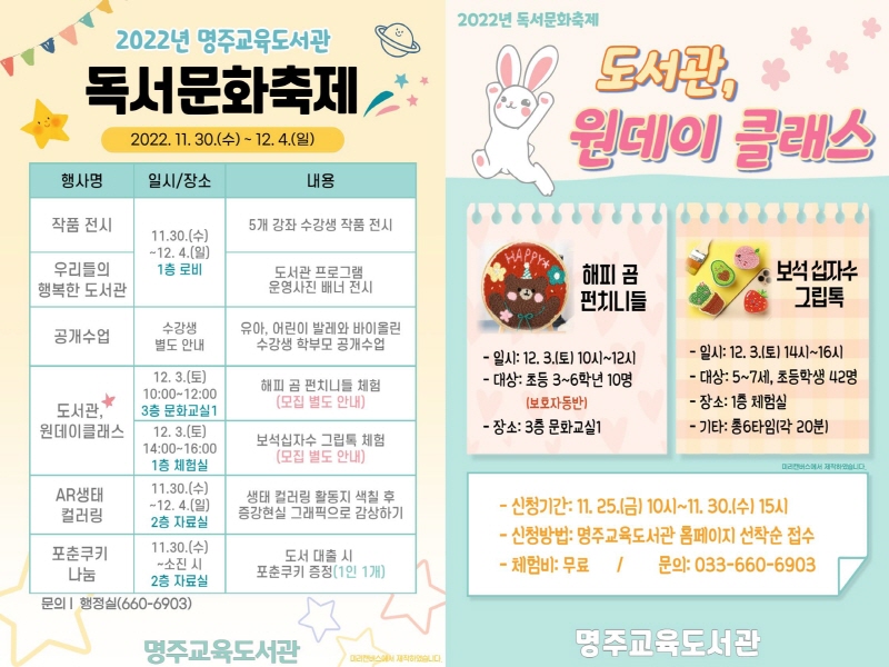강릉 명주교육도서관(관장 안은희)은 11월 30일(수)부터 12월 4일(일)까지 ‘2022년 독서문화축제’를 개최한다.