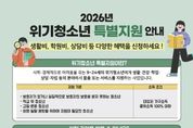 한방통신사 신유철기자 기자 | 동두천시는 2026년 ‘위기청소년 특별지원’과 관련해 사회·경제적으로 어려움을 겪는 관내 위기청소년들에게 다양한 혜택을 제공하기 위한 신청을 3월 30(월)까지 받는다고 밝혔다. 지원 대상자는 9세 이상 24세 이하의 위기청소년(은둔청소년, 저소득 한부모 가족 자녀 등)으로 생활, 건강, 학업, 자립, 상담, 법률 지원 등 다양한 혜택을 받을 수 있다. 신청은 청소년 본인, 보호자, 청소년지도자, 교원, 사회복지사, 청소년 담당 공무원 등이 청소년이 거주하고 있는 행정복지센터에서 할 수 있다. 선정 기준은 소득 기준 중위소득 100% 이하이며, 지자체 ‘청소년복지심의위원회의’ 심의를 통해 적합 대상자 및 지원 금액, 기간 등이 결정된다. 시 관계자는 “모든 위기 청소년들에게 도움이 됐으면 좋겠지만, '국민기초생활 보장법','긴급복지지원법','의료급여법','사회복지사업법' 등에 따라 이미 지원을 받고 있는 경우 동일 내용의 중복 지원은 불가하다”라고 말했다. [뉴스출처 : 경기도 동두천시]