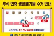 한방통신사 권영분기자 기자 | 충북 진천군은 군민들이 명절을 보다 쾌적하게 보낼 수 있도록 추석 연휴 지역 생활 쓰레기 수거 일정을 일부 조정한다고 1일 밝혔다. 오는 4일은 오전에만 쓰레기 수거가 이뤄지며, 연휴 기간 임시공휴일인 8일 하루는 정상적으로 수거 작업을 진행한다. 이에 각 가정에서는 반드시 수거일 전날 저녁에 생활쓰레기를 배출해야 한다. 이와 함께 군은 연휴 기간 발생할 수 있는 불편에 대비해 3일부터 9일까지 ‘생활쓰레기 상황반(043-539-3461~4)’을 운영한다. 최지혜 군 식산업자원과 주무관은 “명절 연휴에도 군민들의 불편이 없도록 상황반 운영에 최선을 다하겠다”며 “정해진 배출 요일과 시간을 잘 지켜주시길 당부드린다”고 말했다. [뉴스출처 : 충청북도진천군]