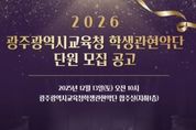 한방통신사 김성의 기자 | 광주시교육청학생교육문화회관은 ‘2026 광주광역시교육청 학생관현악단’ 신규 단원을 모집한다. 시교육청 학생관현악단은 학생들의 음악적 기량과 감수성을 키우기 위해 운영되고 있다. 매주 토요일 합주연습과 연주회, 기획공연 참여 등 다양한 음악 활동을 펼친다. 모집 대상은 광주지역 초등학교 3학년~고등학교 2학년 학생, 같은 연령대 학교 밖 청소년 등이다. 관현악 합주 연주 능력이 있고 음악활동에 관심이 있는 학생, 청소년이라면 오는 3~10일 학교장 추천 서류를 접수하거나 개별 방문 접수하면 된다. 분야는 바이올린, 비올라, 첼로, 콘트라베이스, 플루트, 오보에, 클라리넷, 바순, 호른, 트럼펫, 트럼본, 튜바, 타악기 등이다. 공개 오디션은 오는 13일 오전 10시 학생교육문화회관 지하 1층 학생관현악단 합주실에서 진행된다. 지원자는 자유곡 1곡을 준비해야 하며, 악보를 보고 연주할 수 있다. 단, 반주자는 동반할 수 없으며, 개인 악기를 지참해야 한다.(콘트라베이스, 타악기 제외) 단원 모집 관련 내용은 학생교