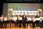 한방통신사 김성의 기자 | 100세 시대를 맞아 전주지역 노인들의 행복하고 건강한 노후생활을 함께 염원하는 노인의날 기념식이 열렸다. 전주시와 대한노인회 전주시지회(지회장 홍성언)는 14일 전주학생교육문화관 공연장에서 우범기 전주시장과 최주만 전주시의회 부의장, 김두봉 대한노인회 전북특별자치도연합회장, 표창 수상자 등 1200여 명이 참석한 가운데 ‘제29회 전주시 노인의날 기념식’을 가졌다. 송민주 대한노인회 전주시지회 사무국장의 사회로 진행된 이날 기념식은 △무지개예술자원봉사단(단장 고대현)과 아름다운 실버 전주의꽃(단장 김인식)의 식전 공연 △노인 강령 낭독 △청려장(장수지팡이) 수여 △전주시장 및 전주시의장 표창 수여식 △노인복지공로자에 대한 공로장 수여식 등의 순으로 진행됐다. 특히 우범기 전주시장은 이날 기념식에서 올해 100세를 맞이한 김옥순 어르신(여, 덕진동)에게 무병장수의 상징인 청려지팡이를 전달했으며, 홍성언 지회장은 축하의 꽃다발을 선물했다. 홍성언 대한노인회 전주시지회장은 “풍성했던 한가위도 지나가고, 땀과 노력으로 이뤄낸 결실의 계절 가을을 맞이해 참석해 주신 우범기 전주