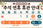 한방통신사 신다은기자 기자 | 여수시도시관리공단은 대명절 추석 연휴 기간(10월 5일~10월 9일) 동안 공단이 운영 중인 공공 체육시설을 휴관한다고 밝혔다. 휴관 대상은 △진남수영장 △망마국민체육센터 △장애인국민체육센터이며, 정상 운영은 10월 10일(금)부터 재개된다. 다만, 연휴 전 개천절인 10월 3일(금)에는 망마국민체육센터 다목적체육관만 운영하며, 10월 4일(토)에는 진남수영장과 망마국민체육센터가 정상 운영된다. 공단은 추석 연휴 기간에도 시설물 안전관리와 긴급상황 대응을 위해 비상근무 체계를 가동해 시민과 관광객들이 안심할 수 있도록 최선을 다한다는 방침이다. 여수시도시관리공단 이사장은 “민족 최대 명절인 추석을 맞아 가족과 함께 안전하고 따뜻한 시간을 보내시길 바란다”며, “연휴 동안에도 공단은 시민의 안전을 최우선으로 하고, 휴관 이후 더욱 쾌적한 환경에서 체육시설을 이용할 수 있도록 최선을 다하겠다”고 말했다. 시설별 세부 운영 일정은 여수시도시관리공단 공공 체육시설 전용 홈페이지에서 확인할 수 있다. [뉴스출처 : 전라남도 여수시도시관리공단]