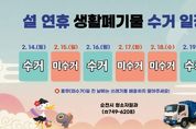 한방통신사 신다은기자 기자 | 순천시는 설 연휴 기간 생활폐기물로 인한 시민 불편을 최소화하고 쾌적한 도시환경을 조성하기 위해 생활폐기물 수집·운반체계를 안정적으로 운영한다고 밝혔다. 설 연휴 기간 종량제 및 재활용, 음식물쓰레기 등 생활폐기물은 14일과 16일에 정상적으로 수거된다. 다만, 설날 당일인 17일 화요일과 18일 수요일은 수거하지 않는다. 수거하지 않는 전날은 배출 자제를 당부했다. 이에 따라 시는 미수거일인 17일과 18일, 생활폐기물 수집·운반 대행업체와 합동으로 기동처리반을 운영해 쓰레기 적체와 관련 민원에 신속히 대응할 방침이다. 한편, 설 연휴를 앞두고 오는 12일, 시 공직자와 환경미화원, 24개 읍면동의 이·통장, 주민자치회, 자원봉사자 등 시민들이 참여하는 설 맞이 합동 대청소를 실시한다. 이번 대청소는 여순로, 매천로 등 4대 관문과 공한지, 이면도로 등 청소 취약지역을 중심으로 진행된다. 시 관계자는 “설 연휴 기간 시민 불편을 최소화하기 위해 생활폐기물 처리에 만전을 기하겠다”며 “생활폐기물은 반드시 수거일 전날 일몰 후에 배출