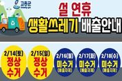 한방통신사 신다은기자 기자 | 고흥군은 설 명절 연휴 기간 동안 생활폐기물로 인한 주민 불편을 최소화하고 쾌적한 생활환경을 유지하기 위해 설 연휴 생활폐기물 관리대책을 수립하고 본격 추진한다고 밝혔다. 군은 2월 14일부터 15일까지는 설 명절에 발생한 생활폐기물을 정상 수거하며, 이 기간 환경미화원 등 약 100명을 투입해 평소와 같이 안정적인 수거 서비스를 제공할 계획이다. 이어 2월 16일부터 18일까지는 연휴 중 발생하는 생활폐기물로 인한 불편을 최소화하기 위해 생활폐기물 기동반을 운영한다. 기동반은 2개 반 6명으로 구성되며, 고흥읍과 도양읍 시가지를 비롯한 상가 밀집지역을 중심으로 우선 수거를 실시하고, 긴급 민원이 발생하면 신속히 처리할 예정이다. 또한, 군은 연휴 기간 생활폐기물 적체와 무단 배출을 예방하기 위해 주요 도로변과 다중이용시설 주변을 중심으로 현장 관리를 강화한다. 아울러 수거 일정과 배출 요령을 군민에게 널리 알리기 위해 마을방송을 통한 읍·면별 안내를 실시하고, 주요 시가지 현수막 게시, 청사 및 고흥읍·도양읍 전광판 송출, 언론 보도 등 다양한 홍보 활동