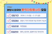 한방통신사 신다은기자 기자 | 광양시는 각종 축제와 국제행사에서의 통역 지원과 외국인 민원 안내 등 다양한 분야에서 통역 봉사에 참여할 시민 외국어 통역자원봉사자를 2월 9일부터 2월 27일까지 모집한다고 밝혔다. 모집 대상은 공고일 기준 광양시에 거주하는 만 19세 이상 시민으로, 영어·중국어·일본어를 비롯한 기타 외국어 구사가 가능하면 누구나 신청할 수 있다. 선발된 통역자원봉사자는 매화축제 등 광양시 주요 축제와 각종 대형 행사에서 외국인 대상 현장 안내 및 통역을 지원하게 되며, 관내 기관·업체 협조 요청에 따른 통역 지원, 외국인 관광객 및 광양시 거주 외국인을 대상으로 한 안내·민원 협조 등 다양한 활동을 수행하게 된다. 시는 통역자원봉사자에게 자원봉사 실적 입력 및 관리 서비스를 제공하고, 활동 우수자에 대해서는 표창 또는 감사패 수여, 향후 광양시 명예통역관 위촉 시 우선 고려하는 등 인센티브를 제공할 계획이다. 아울러 국내 통·번역 특성화 대학과 연계해 통역자원봉사자의 전문성을 높이기 위한 온라인 통역 교육도 운영할 예정이다. 신청은 시 누리집 공고·공지사항에서 신청서를