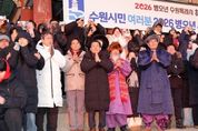한방통신사 신유철기자 기자 | 이재준 수원특례시장은 1일 아침 팔달산 서장대에서 시민들과 함께 해맞이를 하고, “시민 여러분께서 소망하시는 모든 것을 성취하시길 기원하겠다”고 말했다. 이재준 시장은 “올해도 시민 여러분과 함께 수원을 더 새롭고, 더 빛나게 만들기 위해 노력하겠다”며 “모든 시민이 수많은 역사와 희망을 만드는 멋진 한 해가 되길 바란다”고 기원했다. 서장대 일원을 가득 메운 시민들은 떠오르는 해를 보며 함께 소원을 빌었다. 수원시는 12월 31일 저녁부터 1월 1일 아침까지 일원에서 시민들과 함께하는 송년·신년 행사를 열었다. 12월 31일 밤 10시 30분부터 행궁광장 특설무대에서 ‘제야음악회’가 열렸다. 자정에는 여민각에서 제야 타종 행사를 열고 2026년 병오년(丙午年)의 시작을 알렸다. 이재준 시장, 이재식 수원특례시의회 의장, 김영진(수원시병)·김준혁(수원시정) 의원, 시민 대표 등이 타종했다. 이재준 수원시장과 김현수 제1부시장, 4개 구청장, 실·국장 등은 1일 오전 9시 현충탑을 참배했다. [뉴스출처 : 경기도수원시]