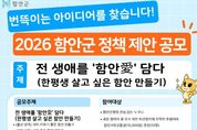 한방통신사 신유철기자 기자 | 함안군은 지역 발전과 현안 해결을 위해 오는 2월 19일부터 3월 18일까지 ‘2026년 함안군 정책 제안 공모’를 실시한다고 13일 밝혔다. 이번 공모전은 다양한 목소리를 정책에 반영하고, 군정에 대하여 군민이 직접 참여할 수 있는 소통의 장을 마련하기 위해 기획됐다. ‘전 생애를 ‘함안愛’ 담다(부제: 한평생 살고 싶은 함안 만들기)’라는 주제로 창의적이고 실현 가능한 정책을 발굴할 예정이다. 공모주제는 △출산·양육 △지역경제·일자리 △생활·교통 △귀농·귀촌 등 4가지 분야다. 공모에는 함안 군정에 관심 있는 국민 누구나 참여할 수 있다. 접수 방법은 국민신문고 또는 함안군청 누리집 ‘고시·공고’에 있는 제안서를 작성해 함안군청 기획예산담당관으로 방문 또는 우편으로 보내거나, 전자우편으로 제출하면 된다. 접수된 제안은 실시 가능성, 창의성, 계속성 등 종합적인 심사를 거쳐 4월 중 결과를 발표한다. 수상자에게는 금상(100만 원), 은상(50만 원), 동상(20만 원), 장려상(10만 원) 총 4개 부문에서 시상금과 군수 표창