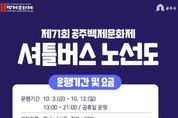 한방통신사 신태공 기자 | 공주시는 오는 10월 3일부터 12일까지 열리는 ‘제71회 백제문화제’ 기간 동안 관람객들의 원활한 이동을 돕기 위해 무료 셔틀버스를 운영한다고 밝혔다. 시는 축제 10일 중 휴일 9일 동안 45인승 셔틀버스를 투입해 강북과 강남을 연결하는 2개 순환 노선을 운행한다. 셔틀버스는 오후 1시부터 오후 9시까지 운영되며, 강남 노선은 1시간 간격, 강북 노선은 30분 간격으로 운행된다. 개·폐막식이 열리는 날은 오후 10시까지 연장 운행된다. 강북(신관) 노선은 금강신관공원을 출발해 대동다숲아파트, 국립공주대학교 북문, 대아주공4차아파트, 기적의도서관, 천년나무3단지, 흥화하브아파트, 현대3차아파트, 우남퍼스트힐, 주공5단지, 코아루아파트를 경유해 다시 금강신관공원으로 순환한다. 강남(신관) 노선은 금강신관공원에서 옥룡동어울림센터, 대웅맨션, 옥룡주공아파트, 영우마을, 공주교대, 공주고등학교, 중동초등학교, 중동사거리를 거쳐 공산성 방문자센터까지 연결된다. 특히 ‘웅진성 퍼레이드’와 ‘무령왕의 길’ 행사 기간에는 강남 노선이 우회 운영돼 금강신관공원에서 옥룡동어울