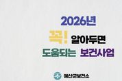 한방통신사 신태공 기자 | 예산군보건소는 2026년 새해를 맞아 군민에게 필요한 보건사업 정보를 알기 쉽게 전달하기 위해 보건사업 홍보영상을 제작했다고 밝혔다. 이번 홍보영상에는 군민 건강 증진을 위해 보건소에서 추진하는 다양한 사업 내용이 담겼다. 주요 내용은 △50세 이상 무료 대상포진 예방접종 △65세 이상 무료 폐렴구균 예방접종 △의료취약지 원격협진 사업 △정신건강 심리상담 바우처 사업 △치매환자 실종예방 지원사업 △난임 시술비 지원 △취약계층 건강관리 및 환자 병원 이송 사업 등이다. 특히 2026년 신규사업으로 △산후조리원 비용 지원사업 △임산부 진료 교통비 지원사업을 포함해 출산 가정의 경제적 부담을 덜고 의료 접근성을 높이는 사업도 소개됐다. 산후조리원 이용 비용은 최대 100만원까지 지원되며, 임신 중 병·의원 방문에 따른 교통비도 지원받을 수 있다. 보건소 관계자는 “이번 홍보영상을 통해 군민들이 보건소에서 제공하는 다양한 서비스를 쉽게 접하고 적극 활용하길 바란다”며 “앞으로도 군민의 건강한 삶을 위해 최선을 다하겠다”고 말했다. [뉴스출처 : 충청남도 예산군]